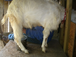 Spring is a big girl, an easy milker. She is near the end of her milk cycle so she just gives me a little over a quart each day on a once-a-day milking. When she is newly freshened, she needs to be milked 2 times a day, and she would prefer 3, as she gives so much milk her udders are very tight. After I've refilled the feed bin for her, she is happy to stand and be milked until she's empty. Then she can stay to finish the last of her feed, as she's the last of the two I have to milk today and there's no hurry. Come on Spring, it's time to go now. No, the food is gone, it's time to go. Reluctantly, she gets down from the milk stand and goes back out to the pasture to check the community feeding stations to see what's left there.
